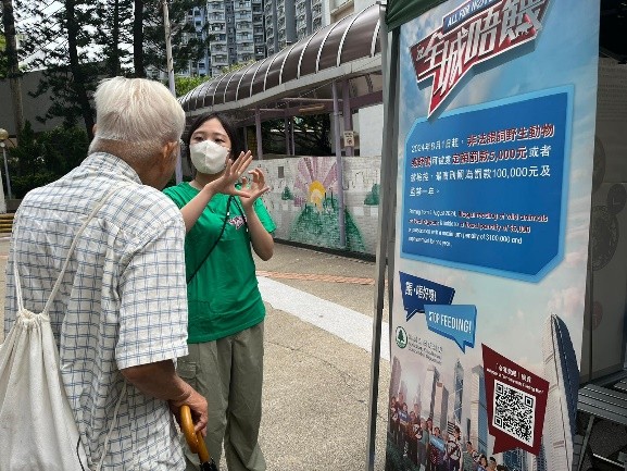 保育基金會到郊野公園和各個社區(尤其是受野生動物滋擾或餵飼問題影響的地方)擺設教育攤位,藉此向市民推廣有關禁止餵飼的資訊;同時亦可透過與不同持分者的交流,了解當區的餵飼情況,以協助漁護署搜集情報。