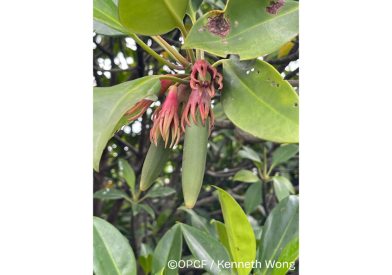 桐花樹(蠟燭果) 桐花樹與秋茄同爲胎生植物,指在果實掉下來之後,藏於果皮中的胎生苗會在果皮裂開之後開始生長。葉柄帶有紅色,亦因果實形如蠟燭火光而得名「蠟燭果」。